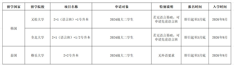 为了拓宽学生升学及就业渠道,满足学生出国提升学历的需求,助力学生成长成才,根据我校与国外友好学校合作协议,现启动2026年秋季学期学生出国专升本项目报名工作。具体情况如下: